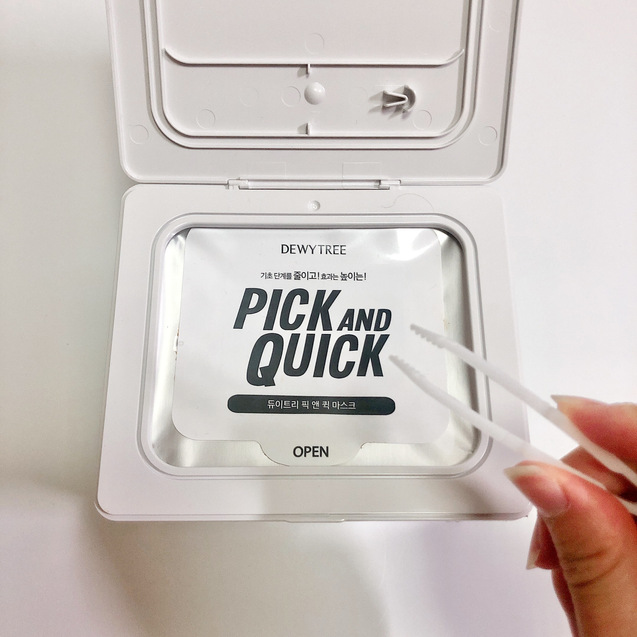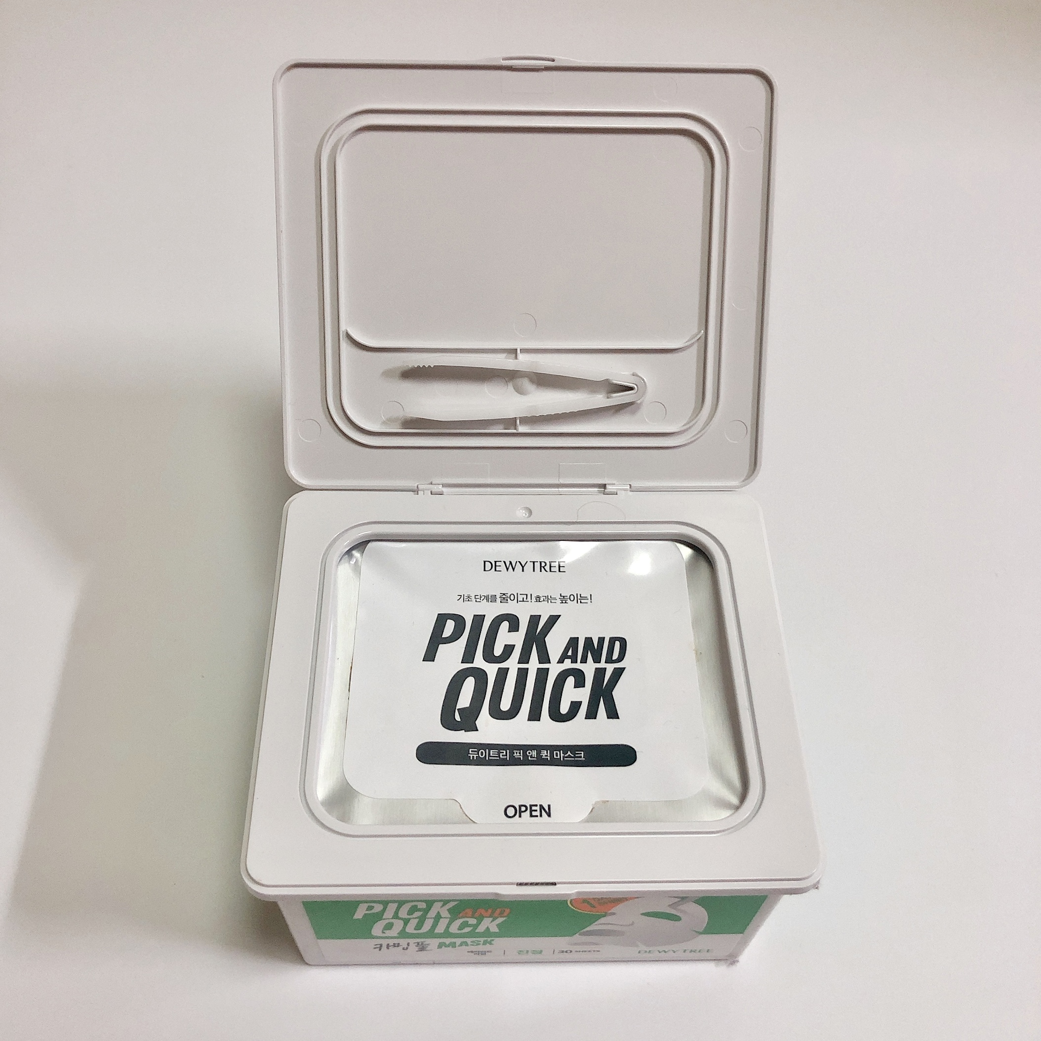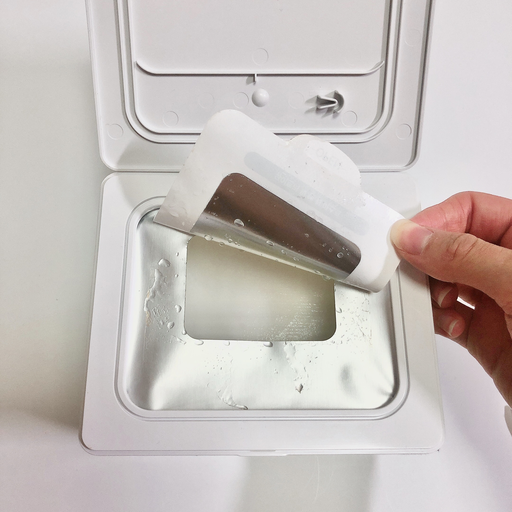 안을 열어보시면 팩이 마르지 않도록 이중으로 닫아둘 수 있는데요. 스티커는 아예 떼지 않고 물티슈 꺼내 쓰듯이 사용하시면 됩니다. 그리고 집게가 달려있는게 포인트인데요!